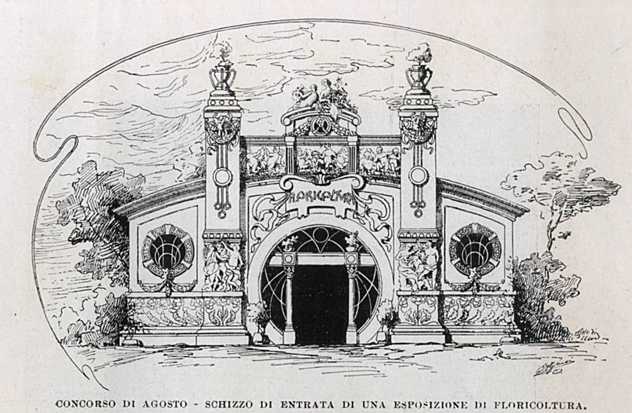 1910 - Concorso di Agosto - Schizzo di entrata di una Esposizione di floricoltura - E. Algisi - Milano, L'Artista Moderno, Torino, volume IX, n. 23, p. 367.