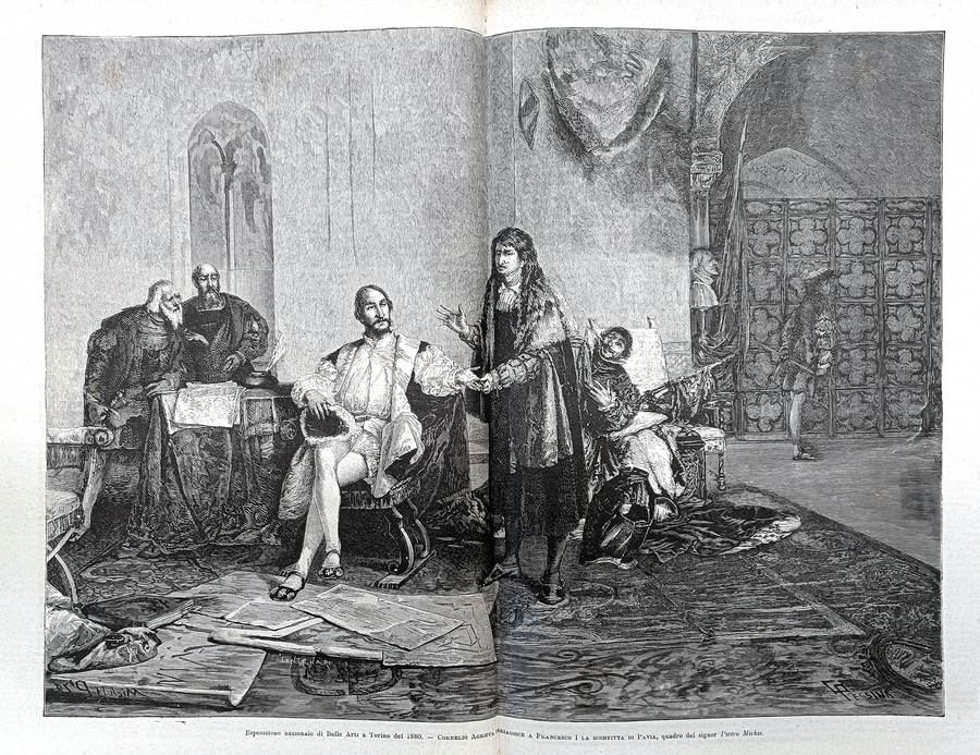 1870 - Carlo Emanuele I, discaccia l'Ambasciatore Spagnuolo (quadro di Alessandro Focosi), L'Illustrazione Popolare, Volume Secondo, Milano, Treves, Anno 1 - N. 24, 21 luglio, p. 189.