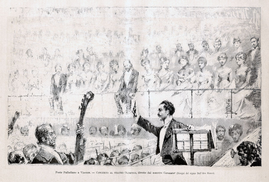 1880 - Feste Palladiane a Vicenza - Concerto al Teatro Olimpico, diretto dal maestro Coronaro, (Disegni del sig. Dall'Oca Bianca), L'Illustrazione Italiana, Milano, Treves, II° semestre, Anno IV, n. 39, 26 settembre, p. 204 ill.