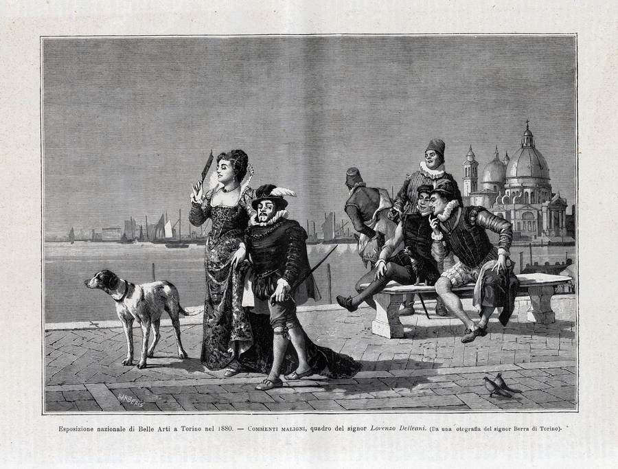 1880 - Esposizione nazionale di Belle Arti a Torino del 1880 - Commenti maligni, quadro del sig. Lorenzo Delleani, (Barberis inc.), L'Illustrazione Italiana, Milano, Treves, I° semestre, Anno IV, n. 26, 27 giugno, p. 413 ill..