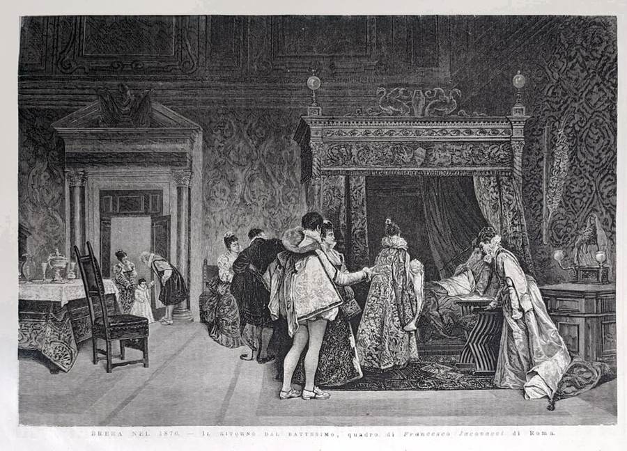 Nel 1876 partecipa all'Esposizione di Brera a Milano con il dipinto Il ritorno dal battesimo.