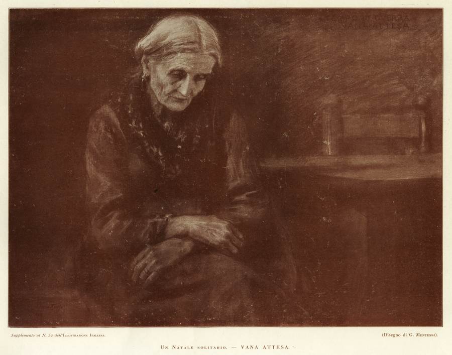 1916 - Il Natale solitario - Vana attesa, Milano, L'Illustrazione Italiana, n. 52, 24 dicembre, p. tav f.t., ill.
