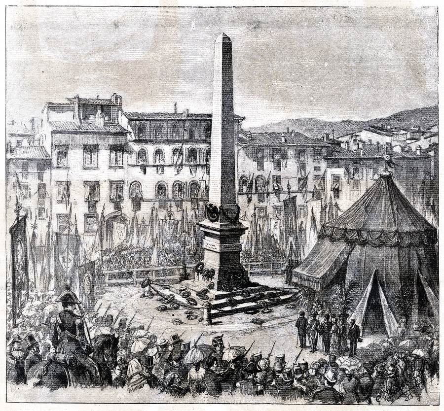 1882 - Firenze - Inaugurazione del Monumento ai Caduti per la Patria, il 22 giugno (disegno del sig. Sanesi), L'Illustrazione Italiana, Milano, Treves, II° semestre, n. 28, p. 28 ill.
