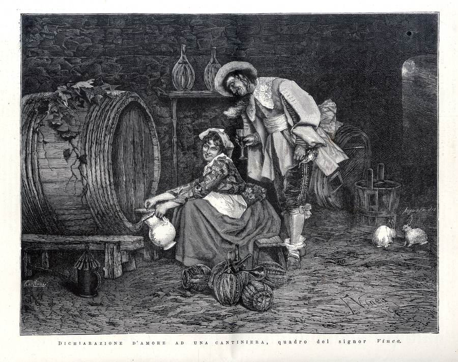 1877 - Dichiarazione d'amore ad una cantiniere, quadro del signor Vinea (Centenari inc.), L'Illustrazione Italiana, Milano, Treves, II° semestre, n. 41, 14 ottobre, p. 244 ill.
