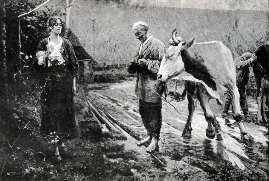 Brera 1891 - Alla vanga, quadro di Arnaldo Ferraguti (Incisione di E. Mancastropa)
